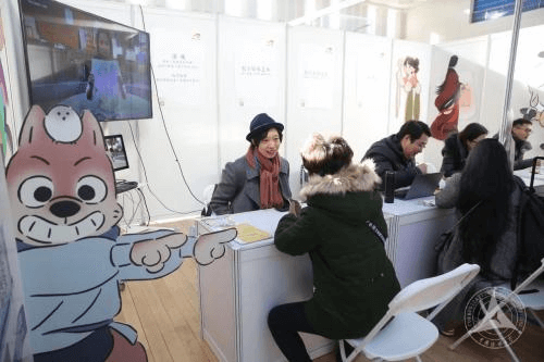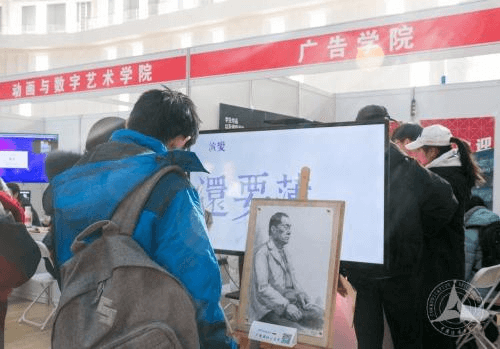 动画与数字艺术学院展位前,《功夫兔和菜包狗》等学院师生创作的动漫形象的特色立牌既可爱又吸睛,吸引了不少考生拍照留念。展台前屏幕上循环播放着学生的优秀毕业设计作品,每位同学还能领到学院特制书签一枚,书签附有温馨提示功能,贴心的标注了艺考的各个时间节点。