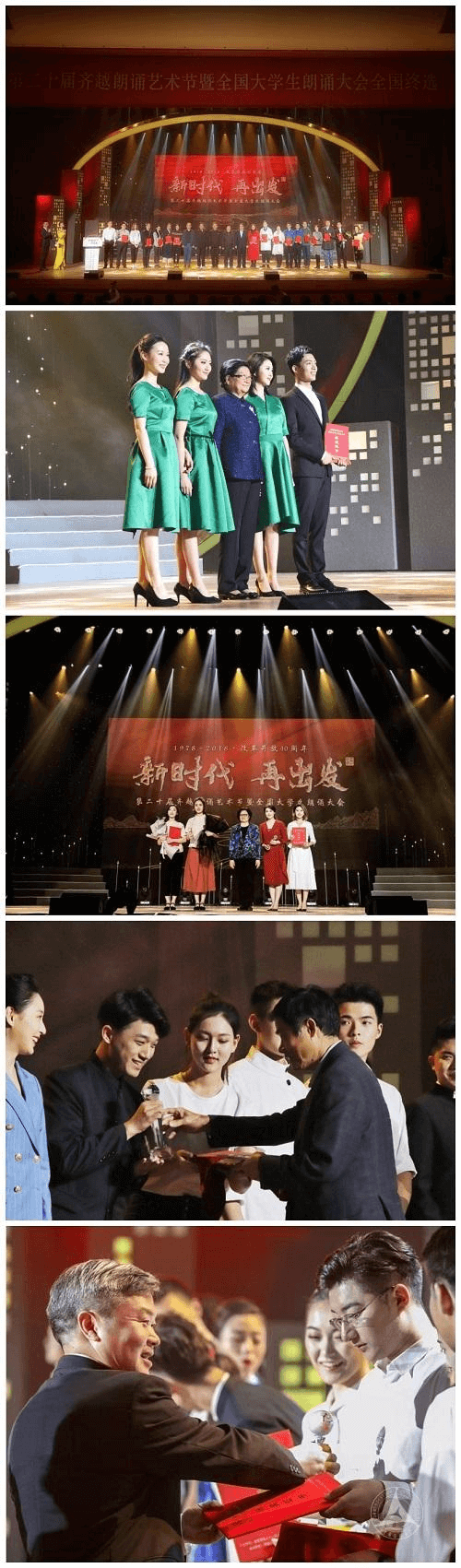 各项大奖揭晓的过程中,来自全国高校的优秀学生作品从不同视角表达了对时代变迁发展的理解与思考,其中,既有对用细节展现伟大情怀的文学作品的深情演绎,如重庆大学作品《阿爸的心愿》、深圳大学作品《手》,又有展现时代最强音的群体诵读,如湖南大学的《奔跑的光影》、暨南大学的《中国的肩膀》、中国传媒大学的《今天,我想对你说》等作品。《老人与海》《和志虹》等荣获本次大会一等奖和二等奖的部分优秀作品也在当晚进行了精彩演绎。