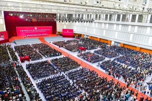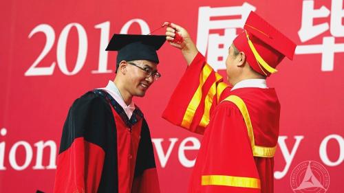 学位授予仪式上,伴随着欢快的乐曲声,廖祥忠校长逐一为获得博士学位的毕业生拨穗、颁发学位证书,并合影留念。全体校领导,校学位评定委员会委员,2019届毕业研究生所属学部、学院领导为获得学士学位、硕士学位的毕业生拨穗、颁发学位证书并合影留念。