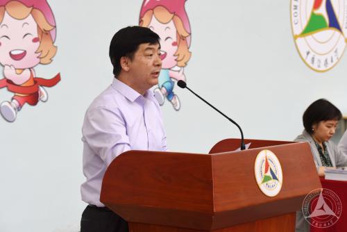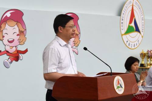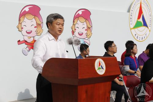 晨风清爽,国旗飘扬。庄严的升旗仪式后,廖祥忠校长在致辞中代表校领导向本次运动会的召开表示祝贺,他表示,一流大学应该有一流的体育,中国传媒大学作为一流学科建设高校,在办学过程中,始终坚持立德树人,始终注重德智体美劳全面发展。体育作为教育的重要组成部分,体育不仅育体,也净化心灵,不仅强健体魄,更培养果敢和坚强意志。学校当前正处于以改革促发展的重要关键期,全校上下,风清气正,斗志昂扬。运动会适时召开,既是振奋人心的体育盛会,也是学校攻坚、发展新活力、凝聚改革行动力的盛会。廖祥忠校长呼吁同学们放下手机,投身运动,重视体育锻炼,关注身体健康,要求中国传媒大学学子全面发展,成为身体素质与专业素养俱优的新时代传媒人才。