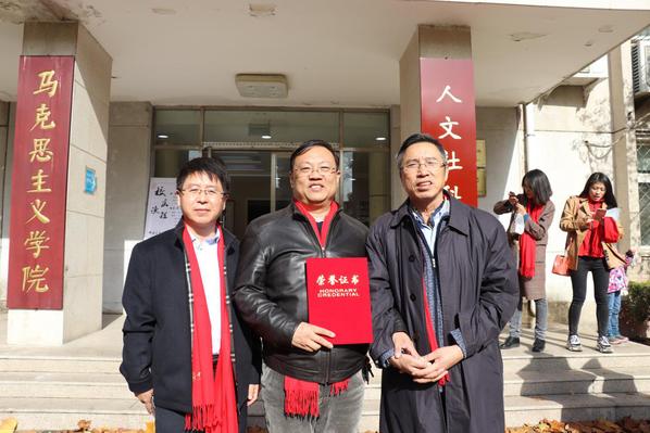 校友娄开阳(正中)与人文学院院长张晶(最右)、党委书记李有兵(最左)合影