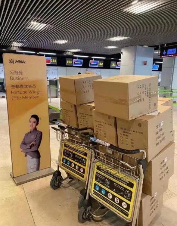 2020年1月25日,陈鑫同学接到西班牙读书会慈善基金会、西班牙华人华侨协会定向捐赠给湖北省慈善总会转武汉市第三中学的防疫物资运输需求,第一时间指导协会负责人提供相关材料,按照规定流程向公司提出通过最早的航班运输回国内,随后及时联系马德里机场相关单位协调该批捐赠物资通关及运输事宜,并协调目的地深圳地面保障落地后物资的通关清关等工作。最终,第一批捐赠物资通过海南航空1月27日HU7984马德里-深圳航班顺利运抵深圳,随后通过协会国内对接人将物资转运至抗击疫情的最前线。